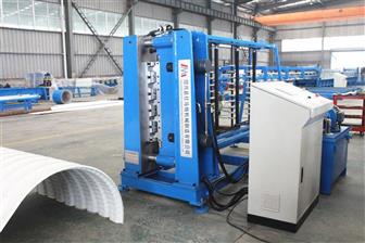 Crimping and Curving Machine consists of feeding device, curving & pressing device and electric control system. The curving machine adopts the formed pressing die to press the "pit” on the formed panels and make the panel curved. Changing the distance of the wave mark and adjusting the depth of "pit” can form into the panels with different radian. This crimping curved machine adopts the PLC control to realize the automatic controlling of wave mark space and the free-set of wave mark space data.